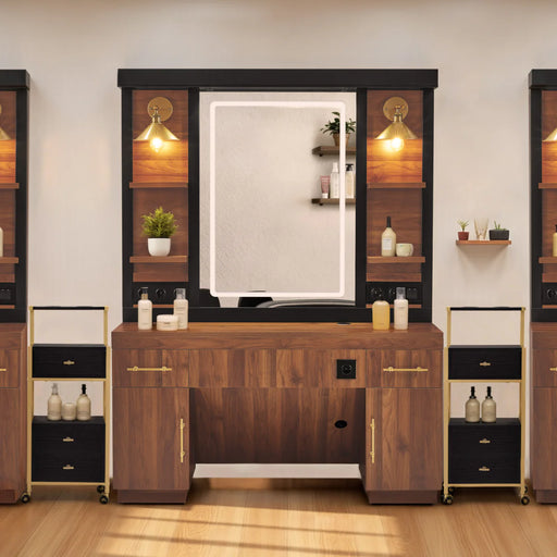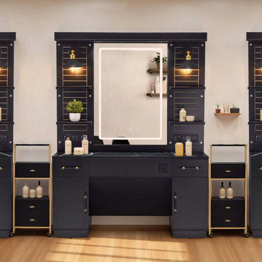 Alle gegevens bekijkenDeze moderne kapperswerkplek is een multifunctionele en stijlvolle toevoeging aan uw salon. De spiegelkast is uitgerust met 6 stopcontacten, 2 kabe...
