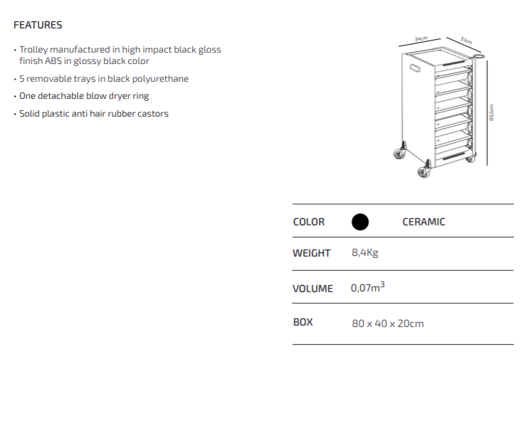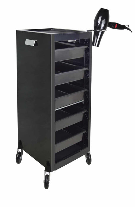 De Vitus werkwagen valt op door zijn functionele eigenschappen. De werkwagen is voorzien van 5 afneembare lades en een föhnhouder. De haarbestendige rubberen wielen maken de Vitus werkwagen uiterst wendbaar en makkelijk in gebruik.