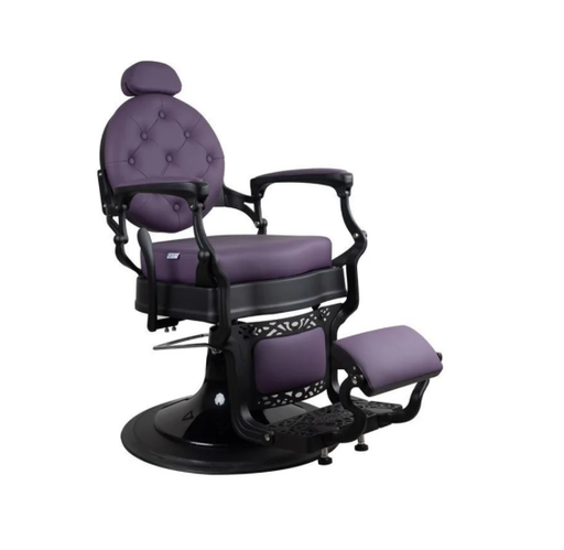 Luxe barberstoel met zwart matte frame en paarse leren bekleding. Voeg een vleugje elegantie en comfort toe aan uw kapsalon met deze stijlvolle bar...