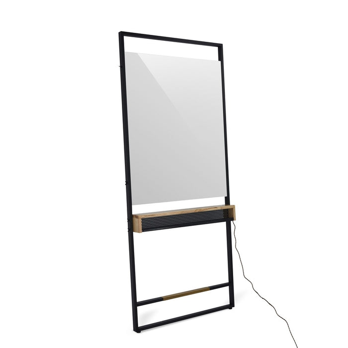 De schoonheid van eenvoud dat is waar het om draait bij de Robin kaptafel. Deze kaptafel is voorzien van een zwart stalen frame en afgewerkt met elementen van massief eikenhout. De led-verlichting zorgt voor een mooie belichting van de eenvoudige lijnenspel in het ontwerp. De goudkleurige roestvrij stalen voetensteun geeft het ontwerp een perfecte finishing touch.