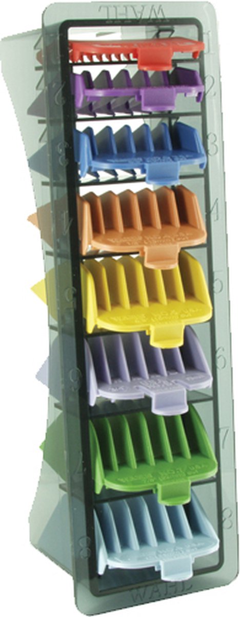 Wahl Set Opzetkammen Gekleurd 3-25mm bevat 8 gekleurde opzetkammen geschikt voor Wahl tondeuses. De set bevat kammen van 3mm, 6mm, 10mm, 13mm, 16mm...