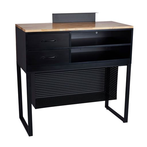 Balie Finch heeft fronten en werkbladen in massief eikenhout. Unit is gemaakt van zwarte melamine met 2 lades met slot. Het heeft zwarte metalen st...