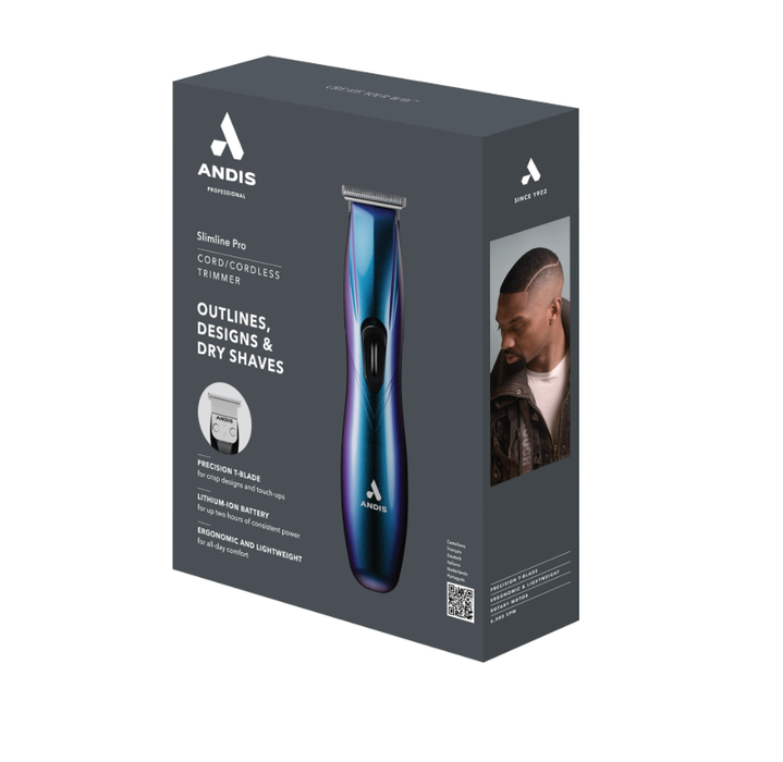 Til je freestyle-spel naar een hoger niveau met de Andis Slimline Pro Li Trimmer! Een slank, lichtgewicht profiel en extra scherpe koolstofstalen T-bladen betekenen dat dit nauwkeurig afgestemde instrument is gebouwd voor ultra-nauwkeurige details. Het slanke formaat is ook ideaal voor het stylen van kinderen. De oplaadbare lithium-ionbatterij heeft een indrukwekkende gebruiksduur van twee uur, of gebruik met het snoer zodat niets je flow verstoort.