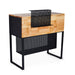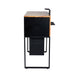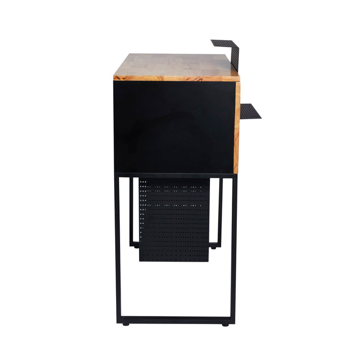 Balie Finch heeft fronten en werkbladen in massief eikenhout. Unit is gemaakt van zwarte melamine met 2 lades met slot. Het heeft zwarte metalen structuur. Rechter opbergmeubel van geperforeerde metalen plaat.