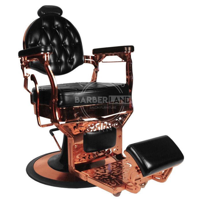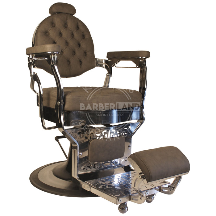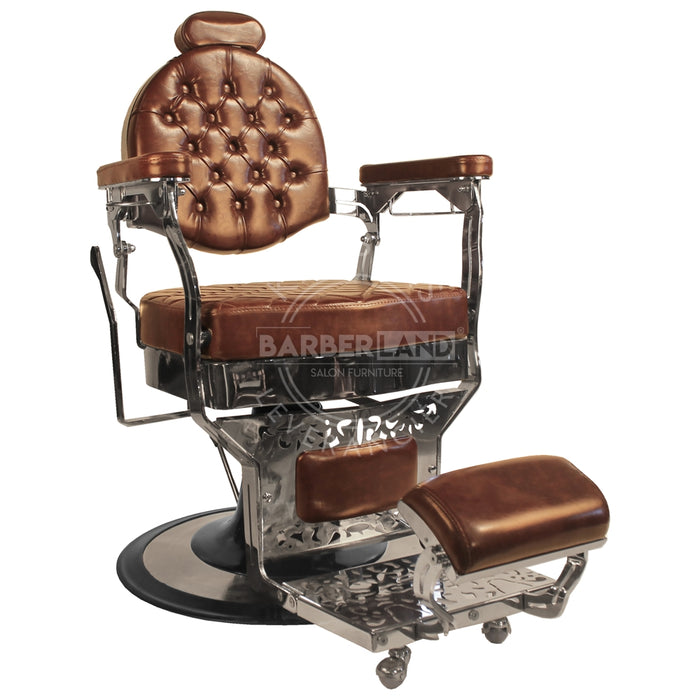 De ronde voet en vezelpompdeksel met mat metalen afwerking geeft de barber chair een luxe uitstraling.