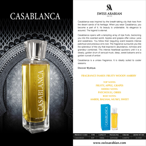 Casablanca is a unisex fragrance. It is ideally suited to cooler seasons.