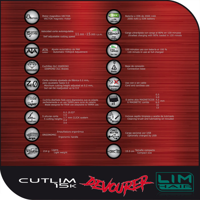 De Lim Hair Cutlim 15k Devourer is de technologisch meest geavanceerde machine op de markt. Het Vector-motortype vertegenwoordigt een evolutie van de bekende magnetische motor met het ATA elektronische besturingssysteem van Torque, zodat wanneer de snijbelasting toeneemt, het vermogen wordt verhoogd, waardoor de snijsnelheid wordt verhoogd van 11.000 tpm tot 15.000 tpm. De messen zijn Diamond afwerking van maximale hardheid en snijprecisie en zijn geschikt voor fade of taper. Bovendien is het formaat zeer compact en het gewicht zeer licht, waardoor het een zeer handzame machine is. Het energieverbruik is laag en met de ultramoderne lithiumbatterij met grote capaciteit kunt u urenlang werken. Onverslaanbaar!!