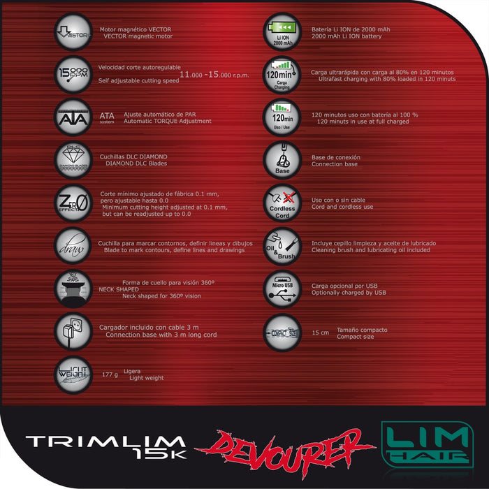 De Lim Hairlim 15k Devourer is de technologisch meest geavanceerde machine op de markt. Het Vector-motortype vertegenwoordigt een evolutie van de bekende magnetische motor met het ATA-elektronische besturingssysteem van Torque, zodat wanneer de snijbelasting toeneemt, het vermogen wordt verhoogd, waardoor de snijsnelheid verandert van 11.000 tpm tot 15.000 tpm. Messen zijn Diamond-afwerking van maximale hardheid en snijprecisie. Het heeft een zeer hoge beheersbaarheid dankzij het zeer compacte formaat, het zeer lichte gewicht en de bovenvorm van de smalle nek met 360 ºC zicht. Het energieverbruik is laag en met zijn ultramoderne lithiumbatterij met grote capaciteit kunt u werken urenlang. Onverslaanbaar!!