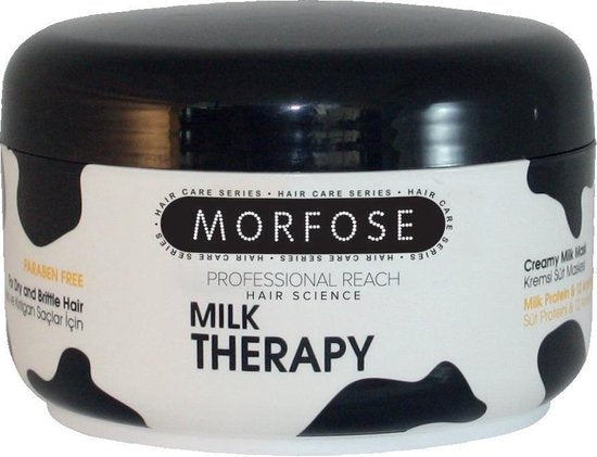 Morfose Milk Therapy Mask is verrijkt met 12 aminozuren en bevat melkeiwitten die het haar hydrateren, regenereren en het nieuwe krachten geeft.