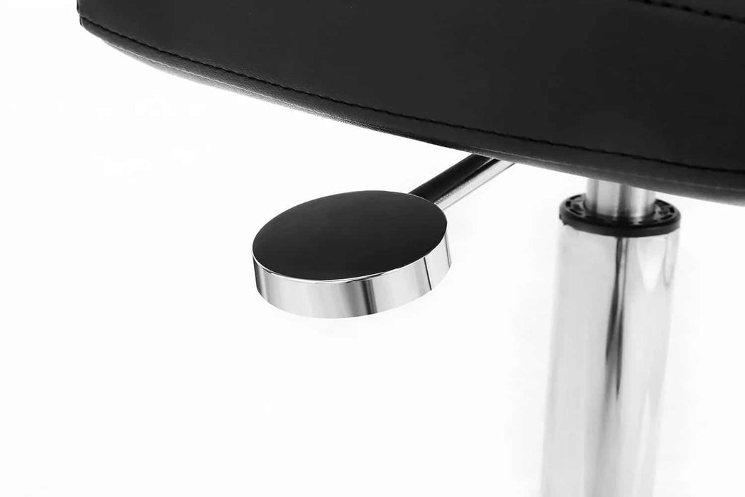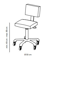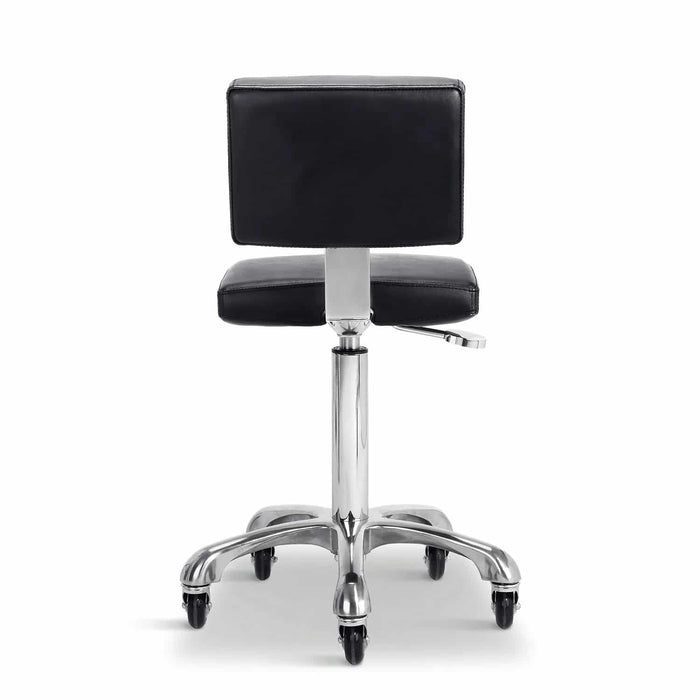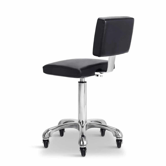 De geweldige kruk Gordon uitgerust met een gasveer voor nauwkeurige hoogteverstelling. Het heeft een vierkante zitting met vlakke rugleuning en soepel rollende siliconen wielen, goede grip en lange levensduur.