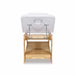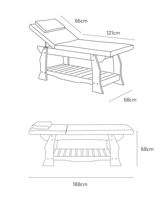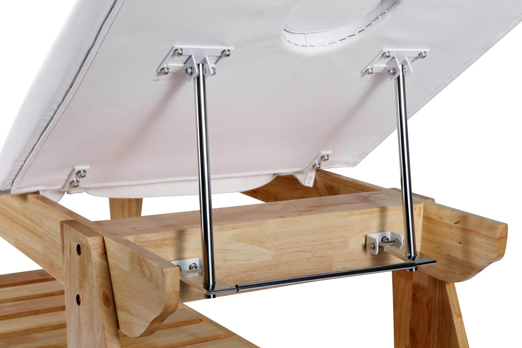 De Olga Massagetafel is een 2-delige beautybank met lichtgekleurd massief houten onderstel en vaste hoogte. De helling van de rugleuning kan handmatig worden versteld. Onderste plank voor opslag.