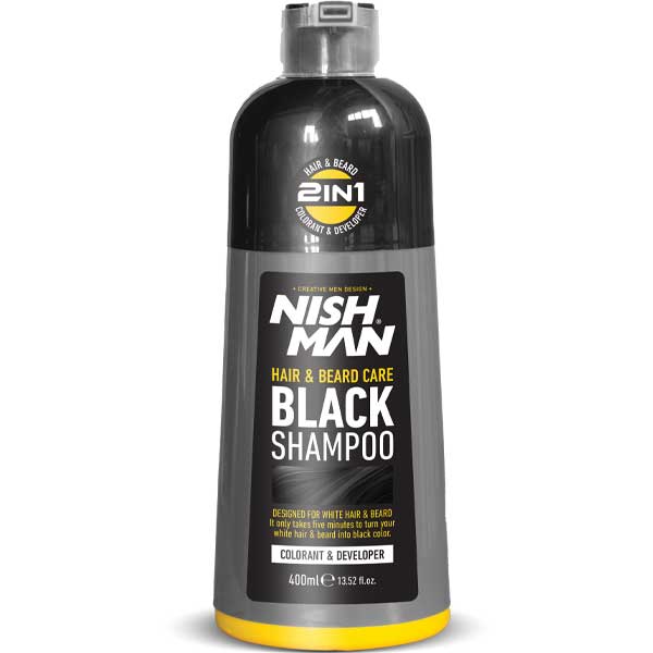 Nishman Hair en Beard Black Hair Shampoo helpt je haar binnen 5 minuten te verven in het zwart. Met de speciale formule wordt je haar zwart nadat je deze shampoo hebt gebruikt. Black Hair Shampoo voedt, beschermt en herstelt de kleur. Inhoud 400ml.