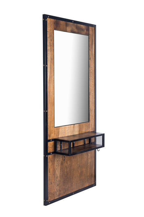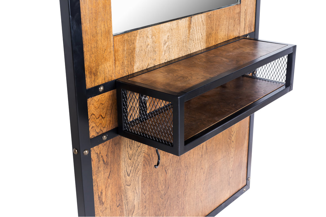 Een industriële, elegante kaptafel gemaakt van een zwart gepoedercoat metaal. Deze kaptafel is voorzien van 2 haken voor het ophangen van een tondeuse en/of een haardroger.