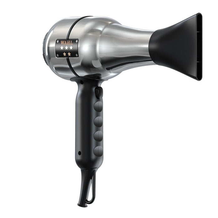 De Wahl Barber Hairdryer heeft een stijlvol, retro chromen design dat net zo goed in de hand ligt als op je station!
