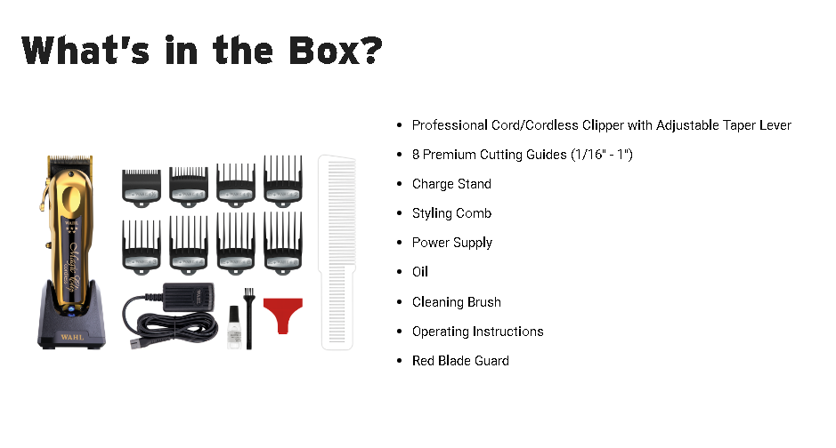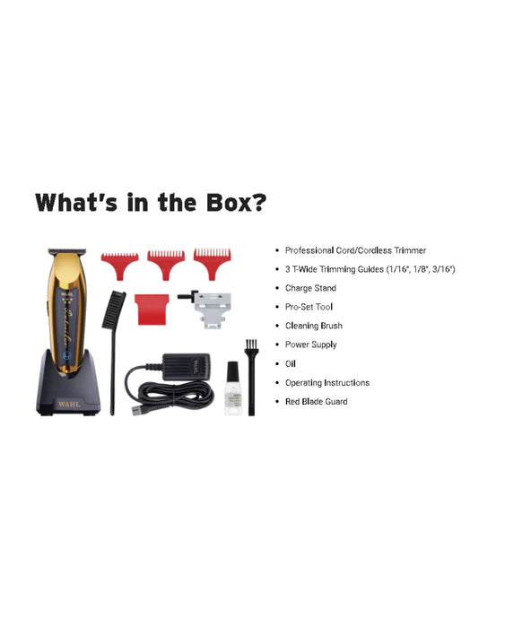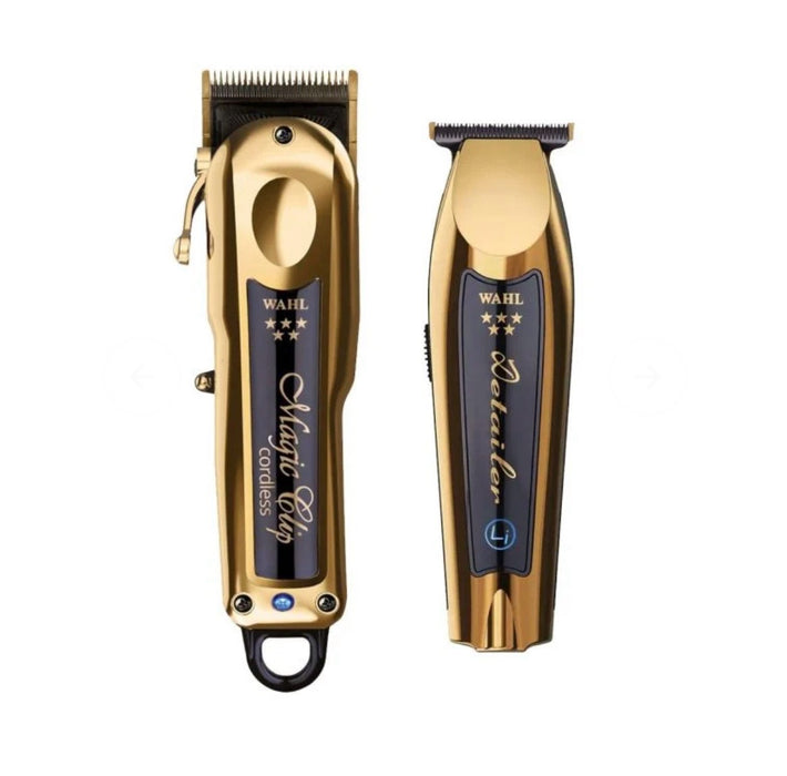 Wahl Tondeuse Set Gold Magic Clip Cordless + Detailer Gold is een extra voordelige set met een Magic Clipper Cordless Tondeuse en Detailer Cordless Trimmer uit de Wahl 5-Star collectie met gouden finish. Met deze set heb je direct een professionele tondeuse en trimmer voor een scherpe prijs. Deze voordeelset combineert krachtige prestaties met chique afwerking en zijn een echte must-have voor iedere kapper of barber.