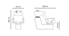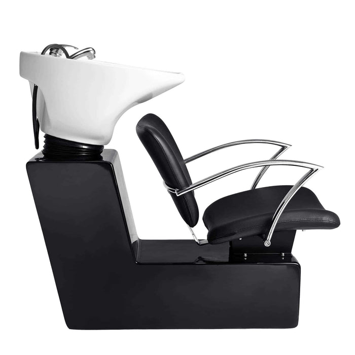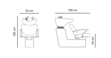 Professionele wasunit gemaakt van houten binnenstructuur, bekleed met brandvertragend PVC-kunstleer en snel herstelschuim met hoge dichtheid. Chromen stalen armen. Witte wastafel en structuur gemaakt van zwart glasvezel. De wasunit Thomas is uitgerust met een verstelbare wasbak in wit keramiek inclusief een mengkraan en een uitneembare douchekop.